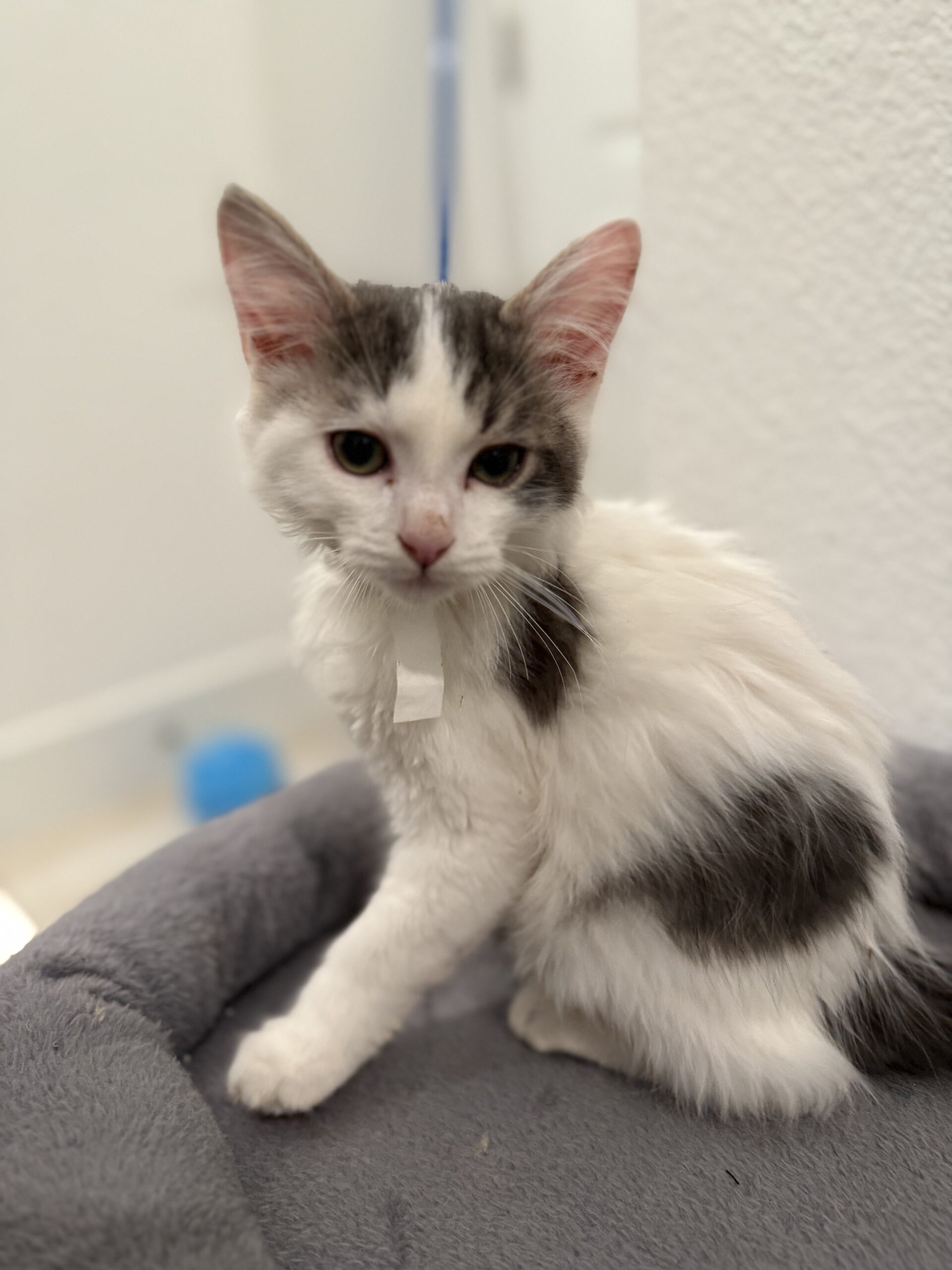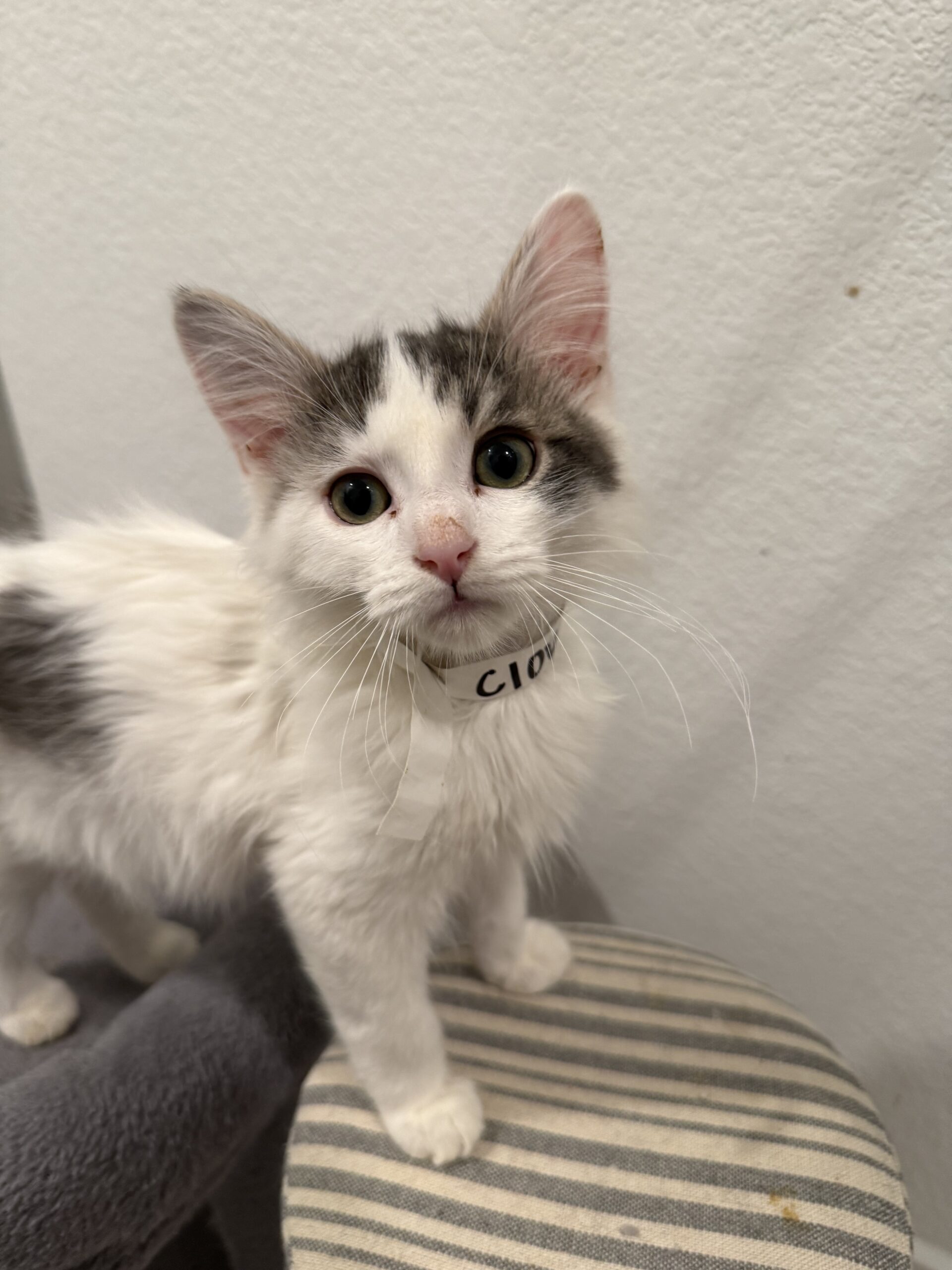 This beautiful white and grey long-haired 12-week-old boy was found with his mom and seven siblings under an abandoned trailer — and he’s blossomed into pure sunshine! Clover is full of excitement, joy, and playful energy. He adores other kitties, loves to explore, and is always ready for cuddles and attention.