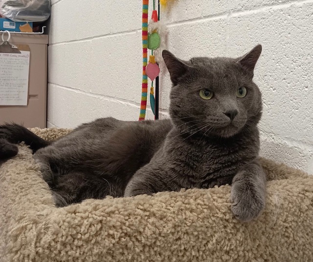 Don’t let his laid-back style fool you — Elfie loves to play and happily jumps in when the toys come out. He’s also wonderfully affectionate and enjoys attention, pets, and gentle companionship with his people. With his soft gray coat, sweet nature, and relaxed confidence, Elfie is the kind of cat who brings a peaceful, happy presence to any home. He’s ready to find a forever family to love and watch over — preferably from a comfy perch close to your side.