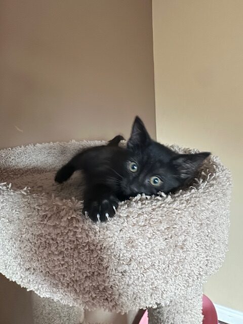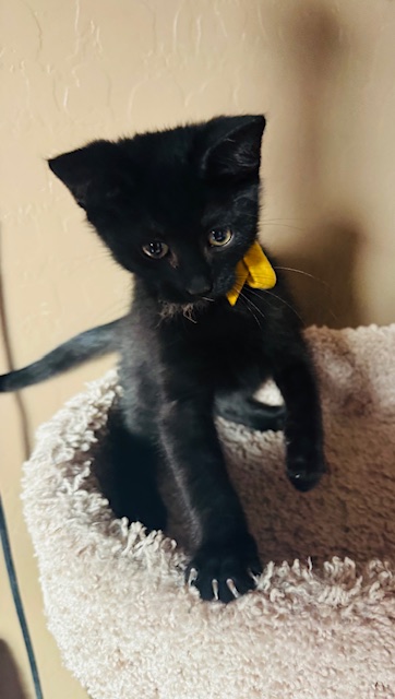 Elio is a handsome 12-week-old short-haired black male kitten with a playful spirit and a heart full of love. This great little guy has just the right amount of energy — he loves to play, explore, and chase toys, but he also enjoys settling down after a good play session.