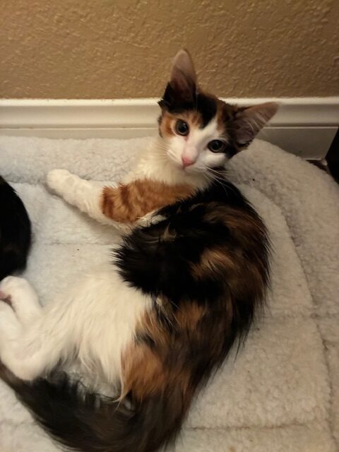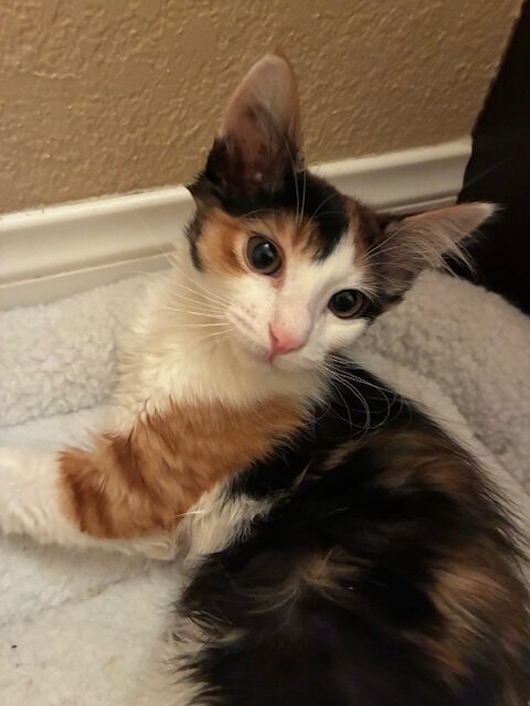 Izzy is a 5-month-old calico girl with a calm, easygoing personality. She’s a chill little sweetheart who loves to relax, watch the world around her, and soak up gentle attention.