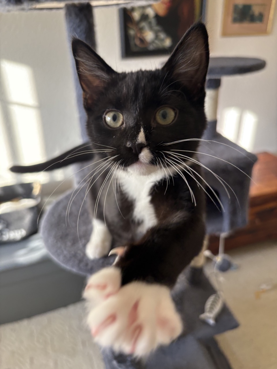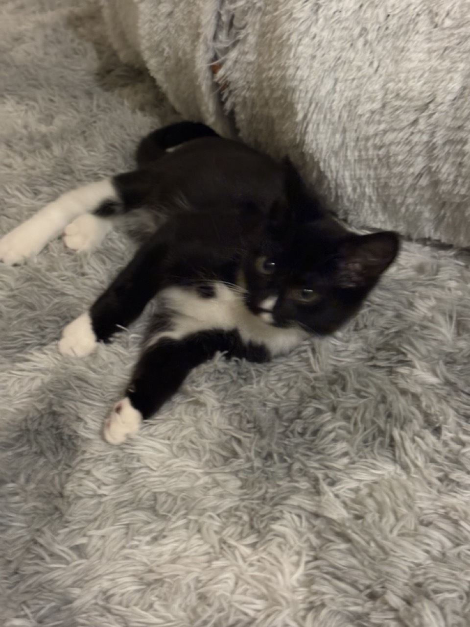 This 3-month-old Domestic Short Hair black and white tuxedo baby is as delightful as they come. She is playful, affectionate, and just wants to be loved. Jojo will happily soak up all your attention and then curl up beside you when playtime is over.