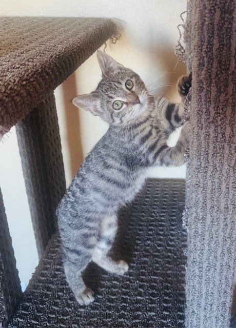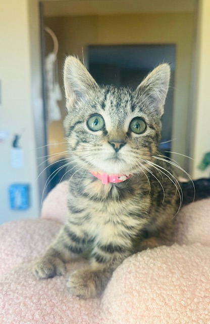 Retro is a beautiful 14-week-old short-haired tabby girl with a quiet charm all her own. This thoughtful little kitty can be a bit shy at first and appreciates having a little time to settle into new environments and relationships. Once she feels comfortable, though, Retro shows her sweet nature and forms gentle friendships with both people and other animals.