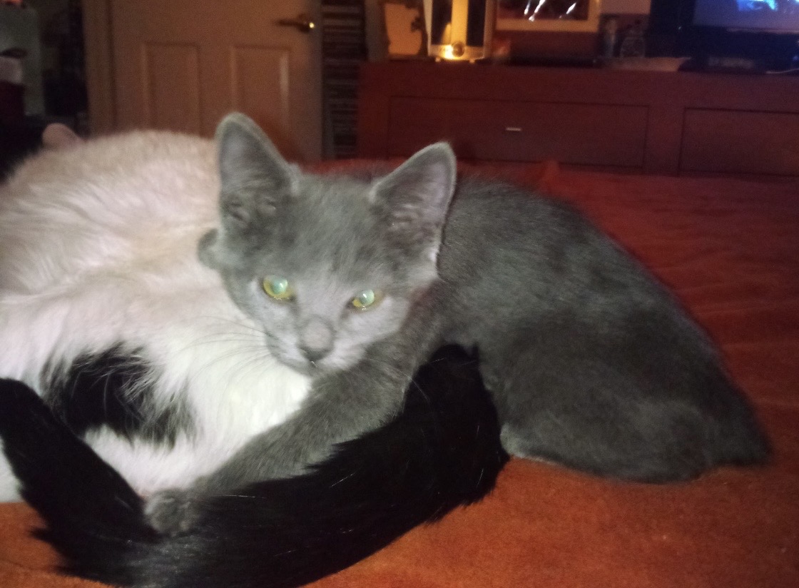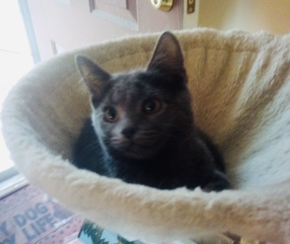 Stormy is a 13-week-old, short-haired gray beauty with a soft coat and a truly lovely presence. This pretty girl is full of personality—she loves to play, especially with her toys, and can often be found happily basking on her cat tree, watching the world go by.