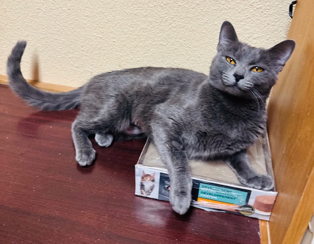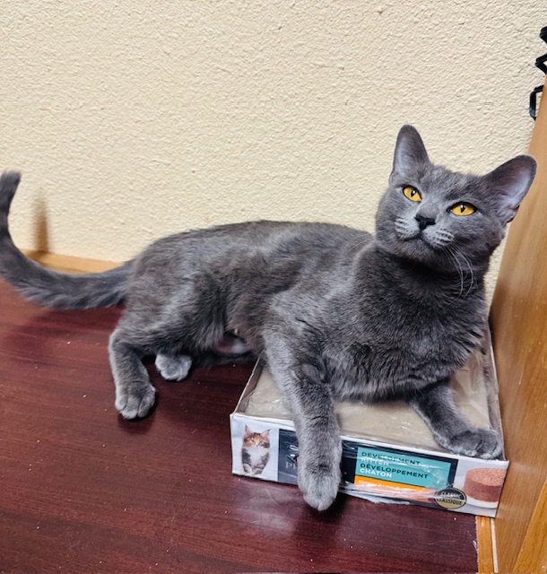 Meet Tontakoba, She is a one-year-old, short-haired, all-gray beauty with a heart just as soft as her plush coat. This lovely girl is the definition of laid-back, calm, resilient, and wonderfully easygoing, yet she absolutely thrives on human connection.