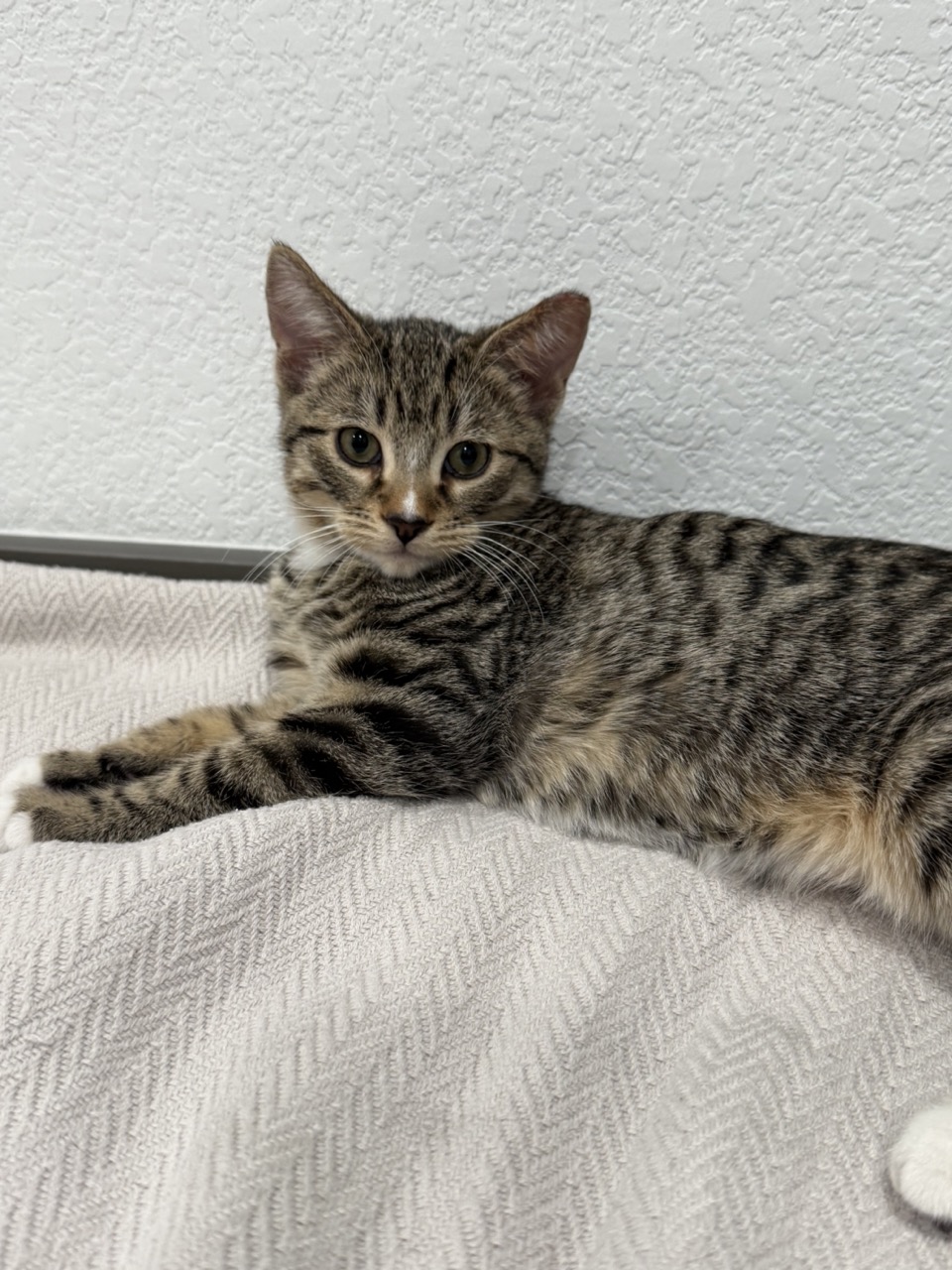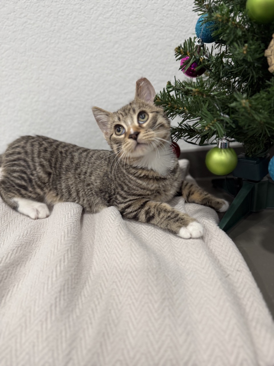 He is a sweet, gentle, playful Domestic Short Hair beauty with adorable white paws and stunning tabby stripes.