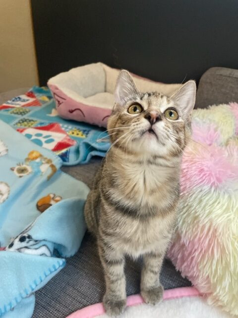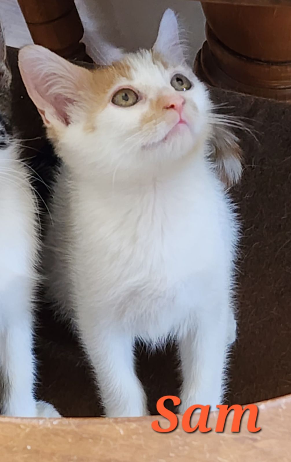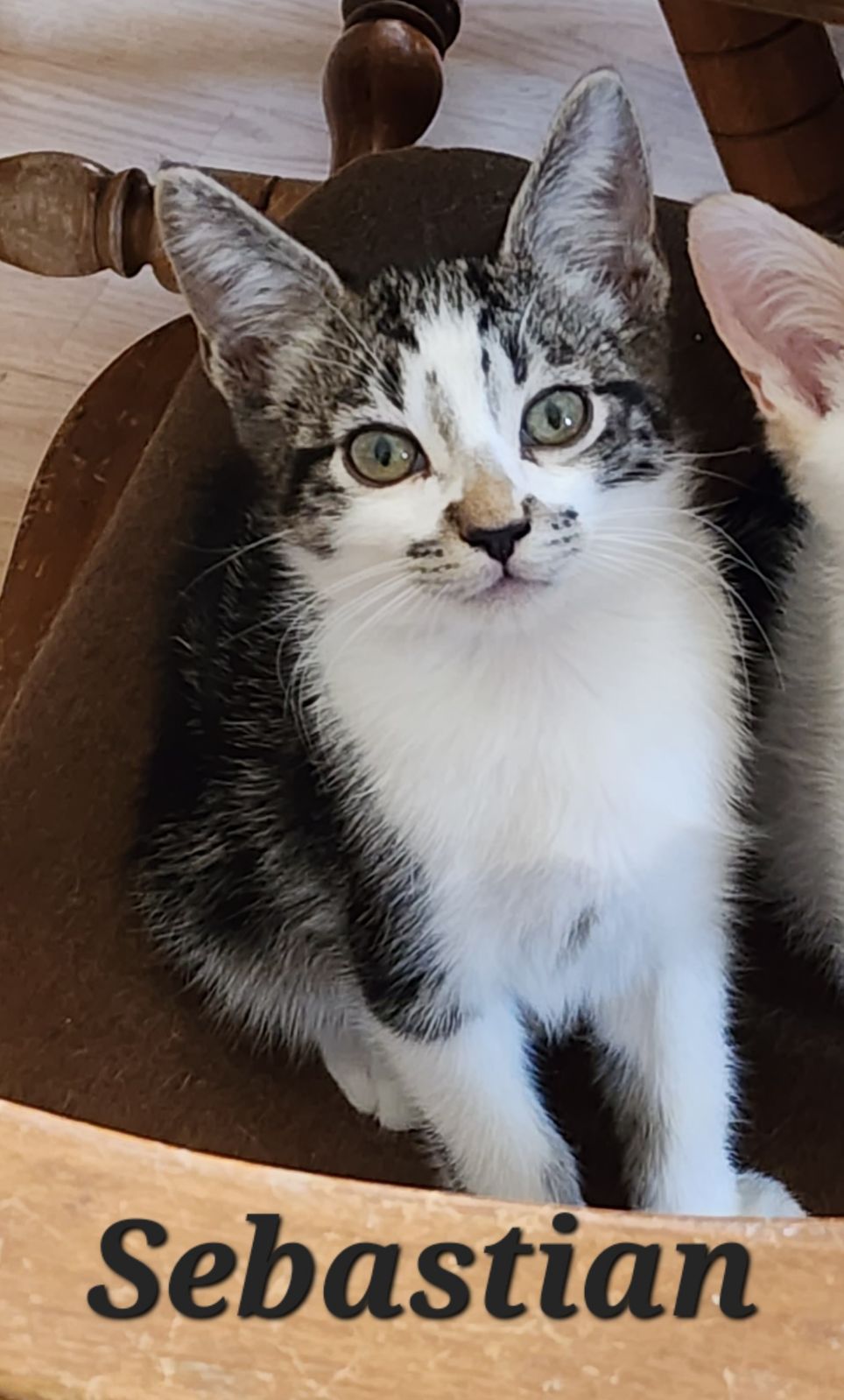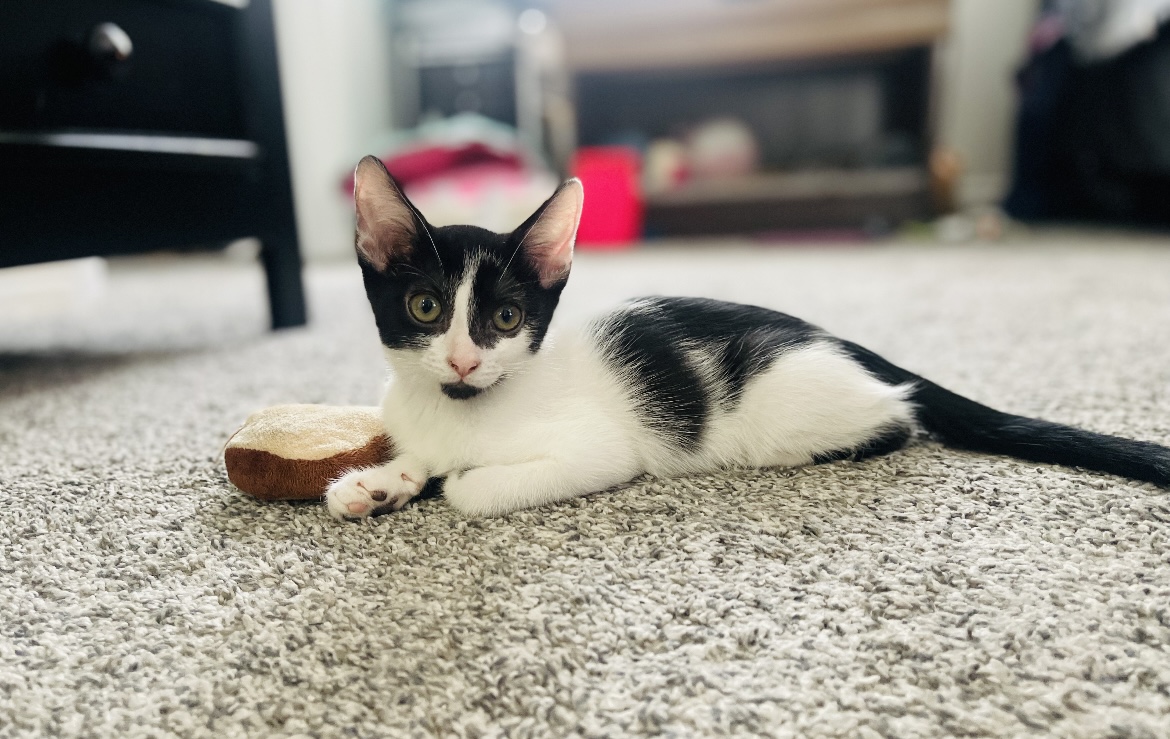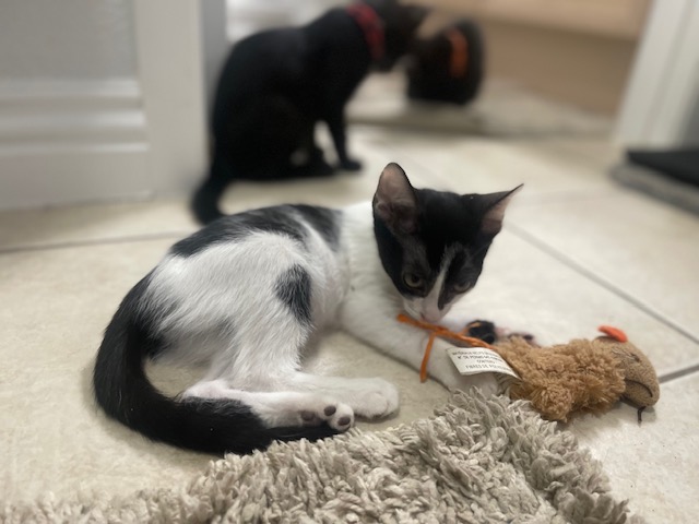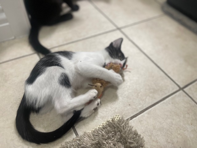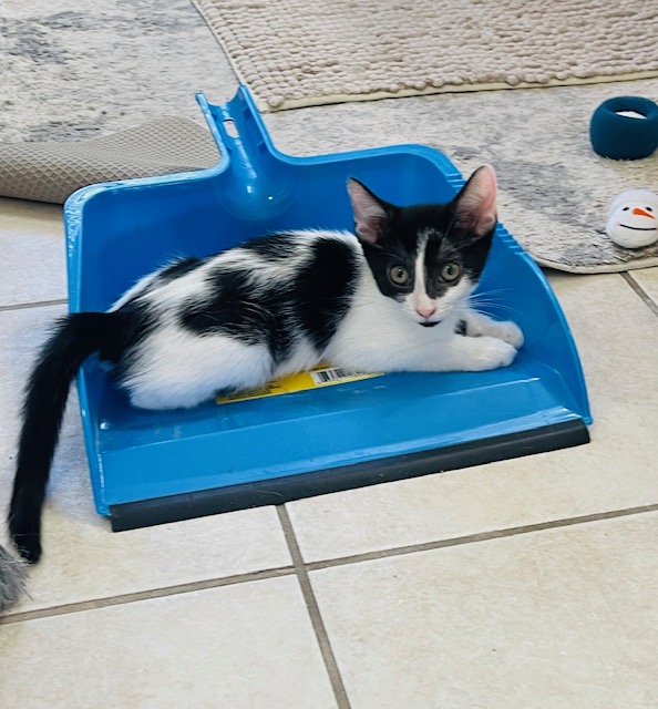 Nancy Kamphaus2023-09-24T13:12:49-07:00Squirt is a black and white beauty. She is also 12 weeks but somewhat petite. She is the only female and only black and white out of the litter. She’s the smallest of the litter. She’s gentle and shy and just a sweet kitten. She loves to play with her big brothers . Her and