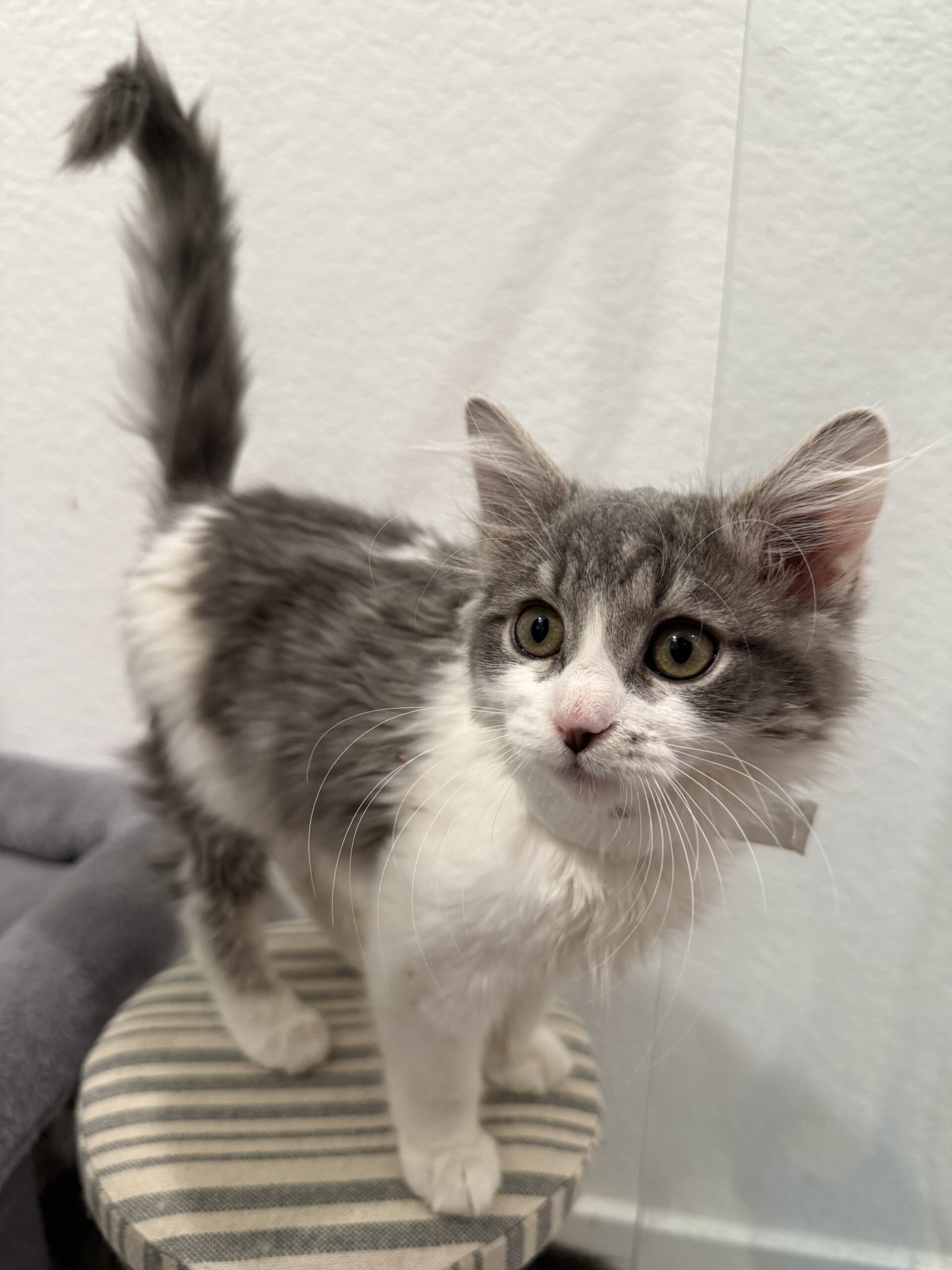 Meet Fern! Fern is a sweet 12-week-old long-haired boy bursting with energy and affection! This beautiful little fluffball was rescued with his mom and seven siblings from under an abandoned trailer — but you’d never know it by how happy and social he is. Fern loves people, adores sitting on your shoulder, and follows his humans everywhere like a