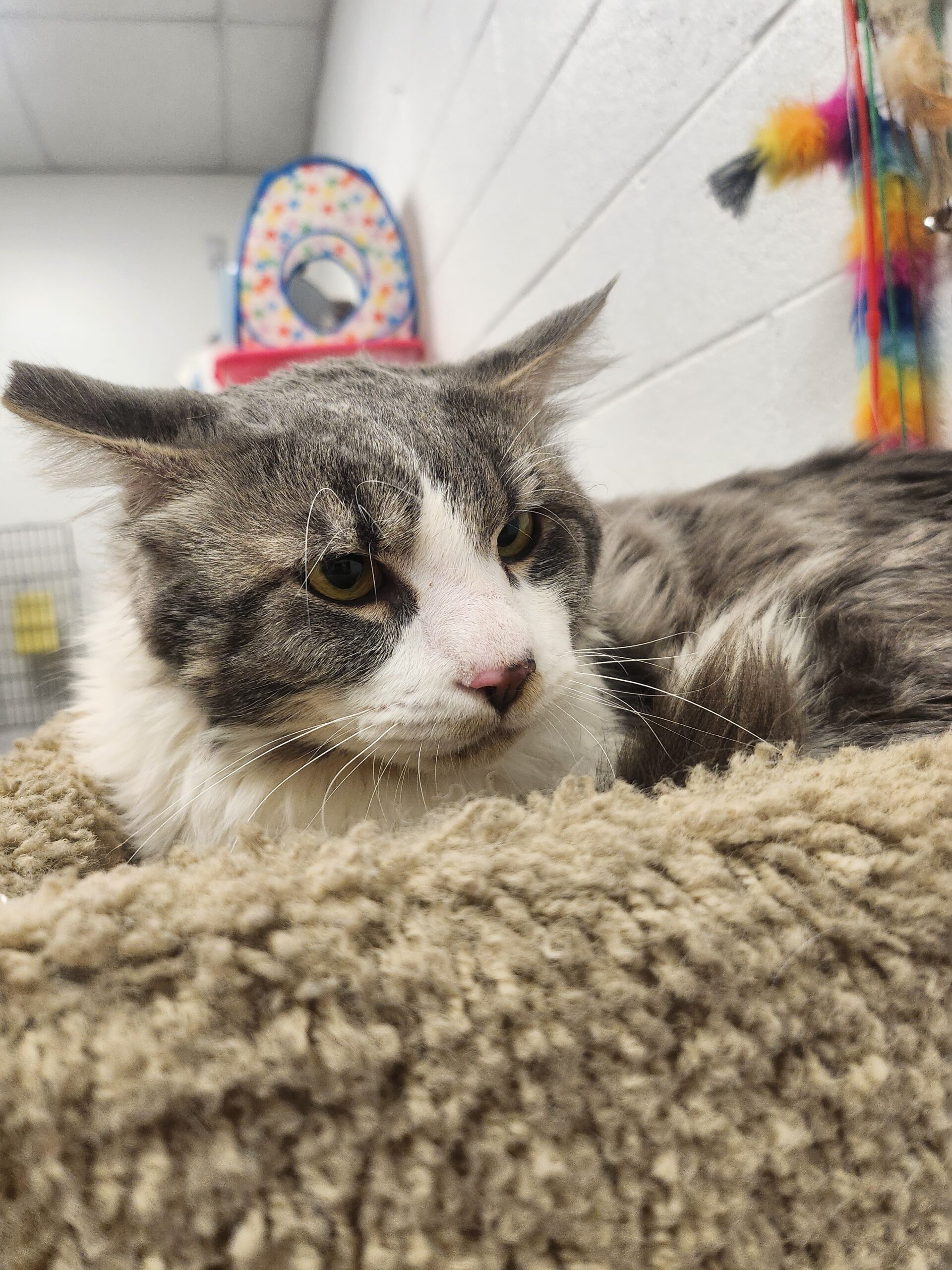 My name is T-Bone I am a 2.5 year male. I am a very sweet shy boy that loves being brushed. I love being cuddled and wet food is my favorite. I wandered into a feral cat colony after being dumped. So I am so happy to be safe.
